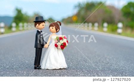 花束ブーケとマスコット人形の幸せな結婚