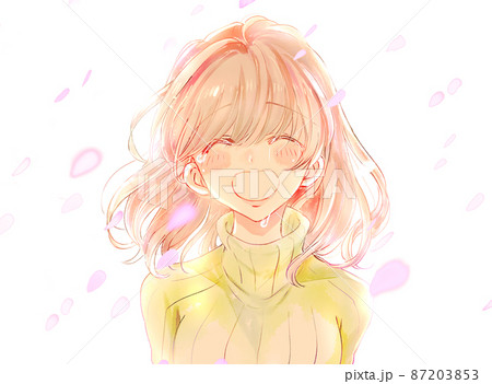 桜吹雪の中笑顔の女性