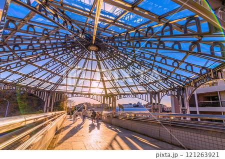 日本の横浜都市景観 年の瀬…横浜市営地下鉄 中川駅などを望む。夕日に照らされる幸福の形…新時代へ
