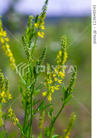 Flowers of Melilotus officinalis is on bright summer background. Blurred background of yellow - green. Shallow depth of field