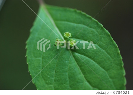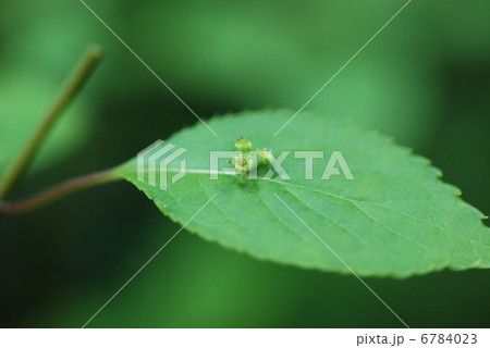 葉の上に緑色の花を咲かす花筏