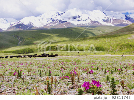 中国 青海省 黄河源流、ザリン湖畔に咲くノウゼンカズラ科ハナゴマ属 Incarvillea comp