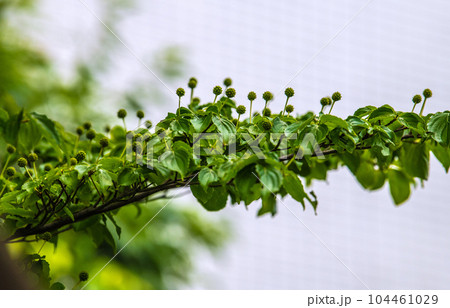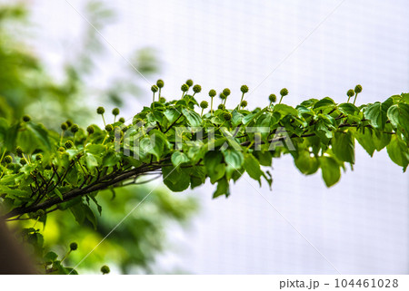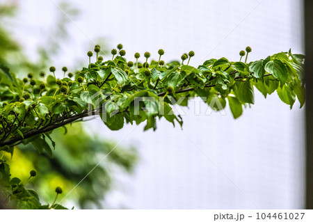 日本の横浜都市景観 雨の中、早くも実。梅雨時の白い花・山法師が見頃を終えて…花言葉は友情=5月29日