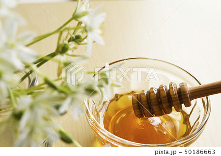ガラスボールに注がれるハチミツシロップ 写真素材