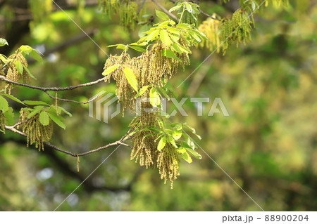 若葉と花をつけたコナラの枝先(朝日を浴びたの小楢の木)