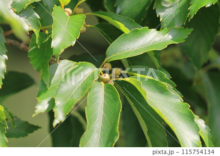 自然 植物 コナラ、七月。秋に熟すドングリはまだ小さくて殻斗にすっかり包まれています