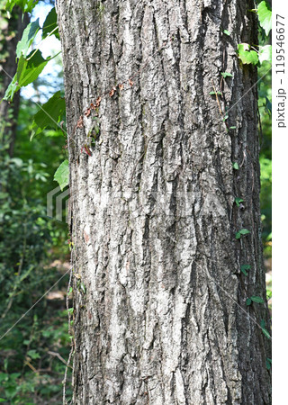 自然 植物 コナラ、葉を落とした二月の裸木。幹の色は灰褐色、縦の割れ目はクヌギより穏やかかな?