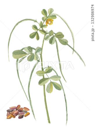 水彩で描いたエビスグサ ケツメイシ 花と種子