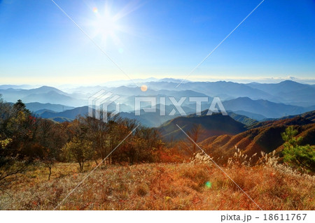秋晴れの錦繡の山並みと富士山
