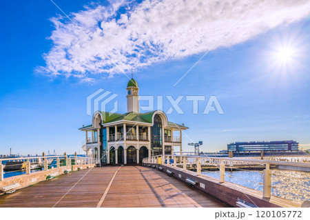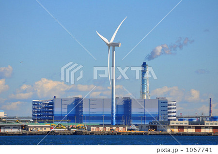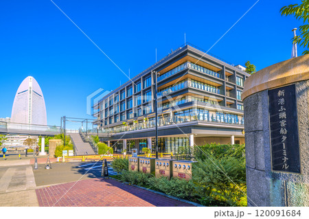 日本の横浜都市景観 新港ふ頭客船ターミナル・横浜ハンマーヘッド、風力発電(奥)などを望む=11月7日