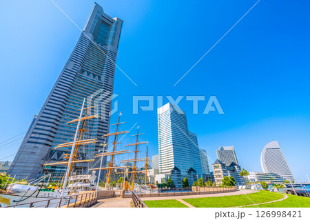 日本の横浜都市景観 帆船日本丸や横浜ランドマークタワーなどを望む