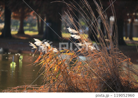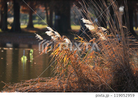 紅葉した水辺の葦(ヨシ)の穂