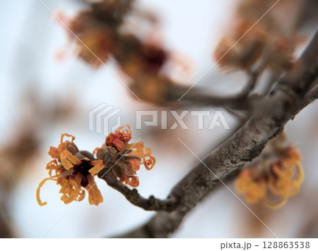 雪が降った2月に咲きはじめたハマメリス・インターメディア「エレナ」の花