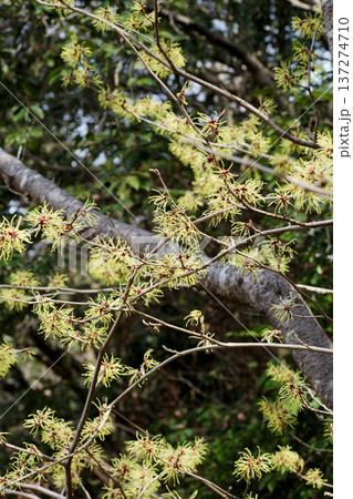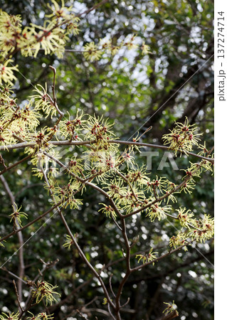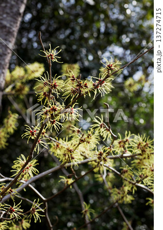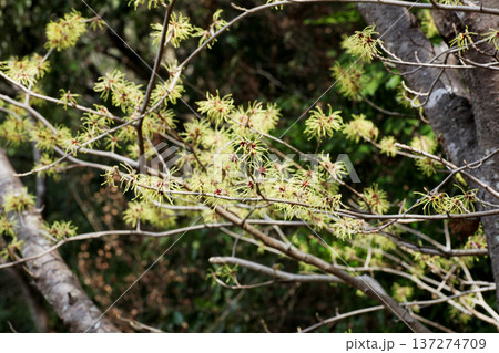 枯葉の残った枝に花をつける早春のマンサクの木