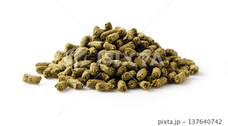 白背景に山盛りにされたうさぎの餌(ペレット)の切り抜き素材