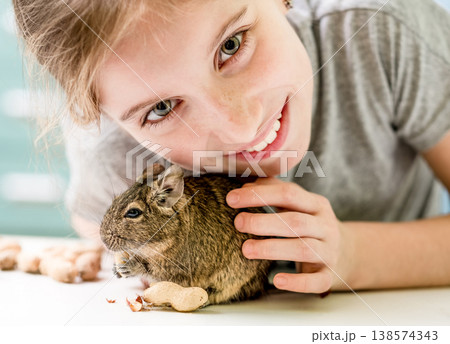 Portrait of young girl with degu squirrel and nuts, close-up.