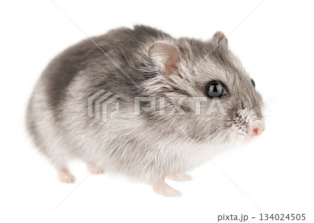 A small, fluffy gray and white hamster exploring its surroundings against a plain background