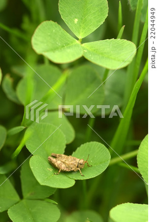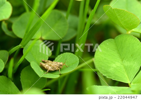 クローバーの葉の上に乗っているハラヒシバッタ