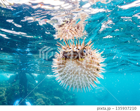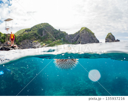 怒って膨らむハリセンボン半水面撮影。監視台前。ヒリゾ浜南伊豆町中木 静岡県伊豆半島-2025 日本有