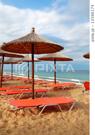 Sunbeds on a beach during sunrise, Halkidiki, Greece