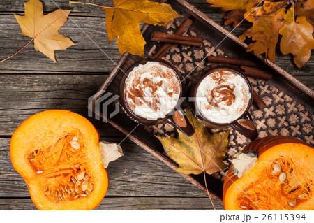 Spicy latte with pumpkin and whipped cream on wooden background. Hot coffee in glass mug and autumn leaves.