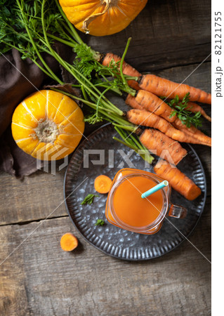 Fresh natural mixed juice, healthy food concept. Glass jar of fresh carrot juice with fresh carrots and pumpkin on a wooden rustic table. Top view flat lay background.