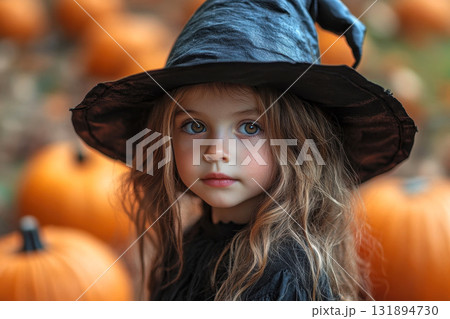 a little kids in costume celebrating halloween together with halloween pumpkins.