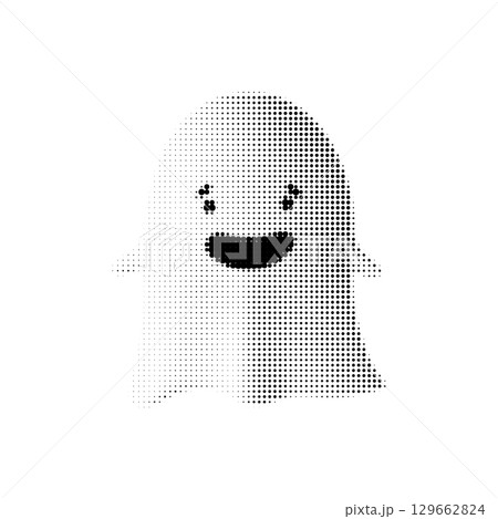 Happy ghost vector illustration in halftone black and white style. Cute smiling cartoon character for Halloween. Isolated design perfect for kids decor, stickers, posters, and festive graphics.