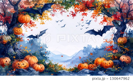 水彩風のハロウィンフレーム|かぼちゃとコウモリと秋の木々