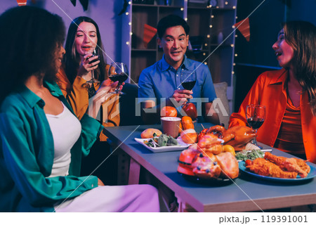 Costumed friends, boys and girls, attending Halloween party, celebrating with non-alcoholic drinks and treats, dancing and laughing. Night club event