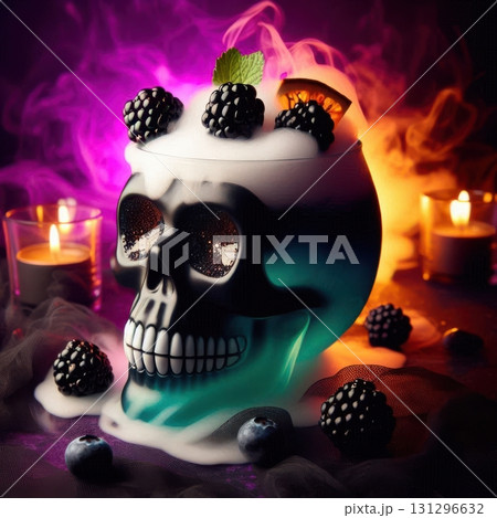 Spooky beverage close-up with dry ice and glowing background for creepy party stock content.