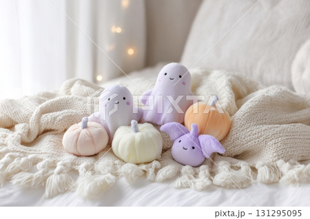 Dreamy linen bedding with plush pastel toys makes cozy Halloween scenes for lifestyle and kids-themed prints.