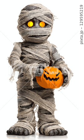 Cute Halloween Mummy Character Holding Jack o Lantern Pumpkin on white background