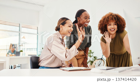 Happy creative women, video call and meeting on computer in online collaboration or greeting at office. Group of female employees wave in hello, virtual communication or networking in startup at work
