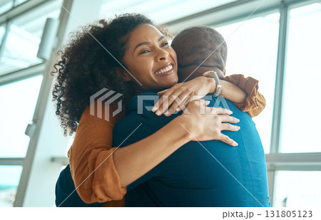 Couple hug, reunion at airport and travel with love, care and relationship, happy to see partner with black people. Hello, happiness and commitment, traveling and embrace, together and greeting