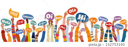 Diverse hands holding colorful speech bubbles saying hello in many world languages