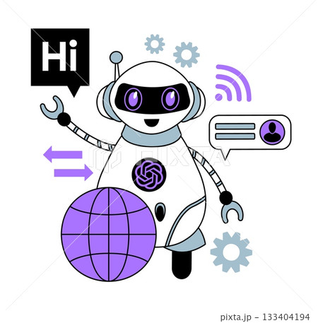 Robot software. Chat bot. AI assistant. GPT technology. Artificial intelligence chatbot. Virtual call support. Global connection. Android mobile service. Robotic character greeting. Vector concept