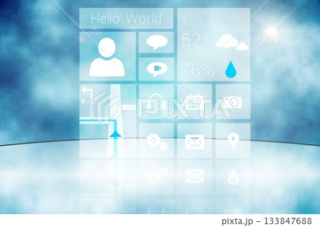 Translucent UI panels are floating above glass floor with icons and text against blue mist backdrop