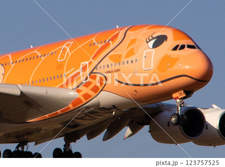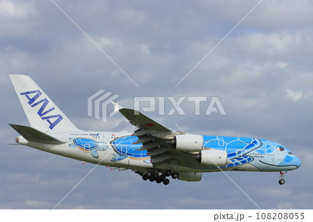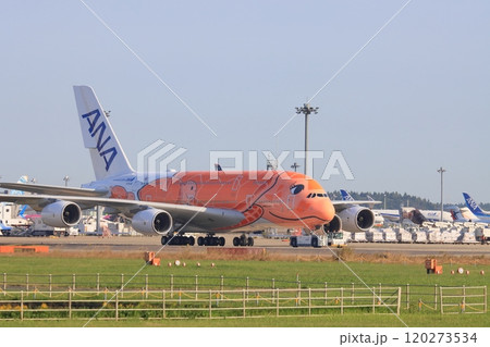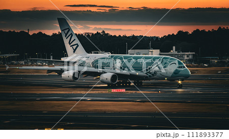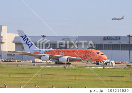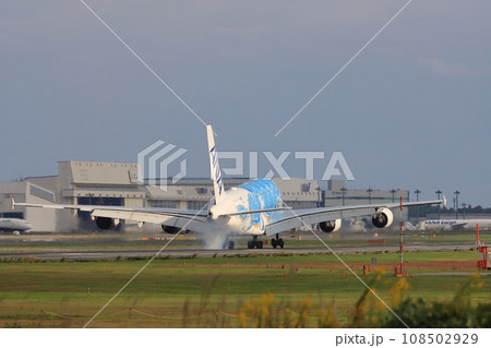 成田空港へ着陸後駐機場へ向かうエアバスA380 旅客機