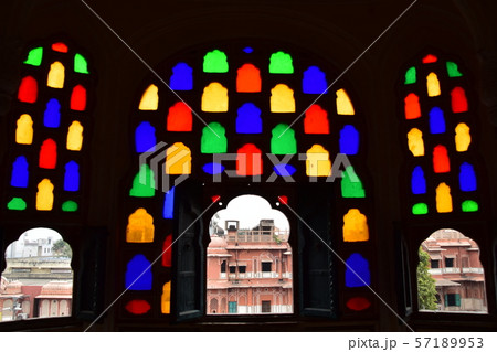 インドのジャイプル 風の宮殿の部屋 美しいステンドガラスとドアからの眺め