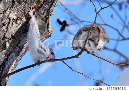 木の枝に登りアタックするエゾモモンガ