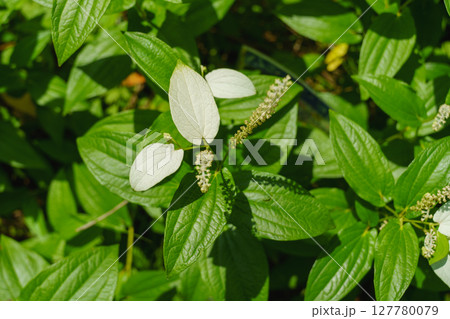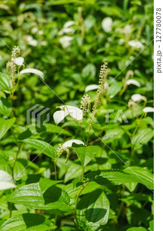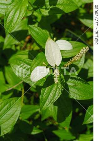 初夏の日本の庭に咲く白と緑の葉と小さな花穂を持つハンゲショウの花