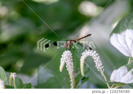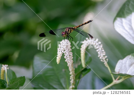 ハンゲショウの花で一休みするハッチョウトンボの メス