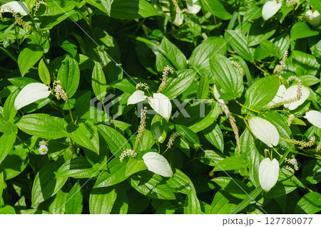 初夏の公園に咲くハンゲショウの白と緑の葉と白く小さい花穂