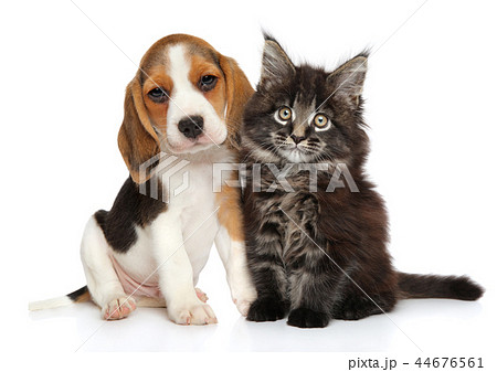 Puppy and kitten on white background