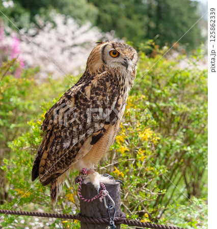 自然豊かな公園の止まり木に佇むワシミミズク