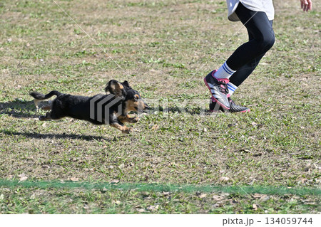 ハンドラーとダッシュするダックス ドッグアジリティ ドッグスクール ドッグスポーツ