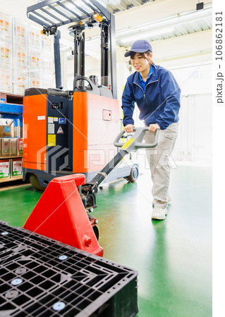 倉庫でハンドリフトを使って荷物を運ぶミドルの女性作業員