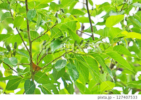 雨降りの中の緑色の小さな緑色のハンノキの実(夏、六月)