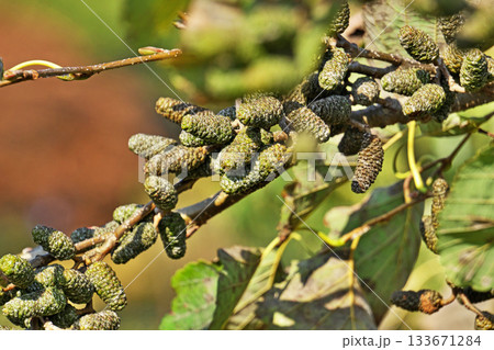 昨年の茶色のヤマハンノキの実(秋、九月)